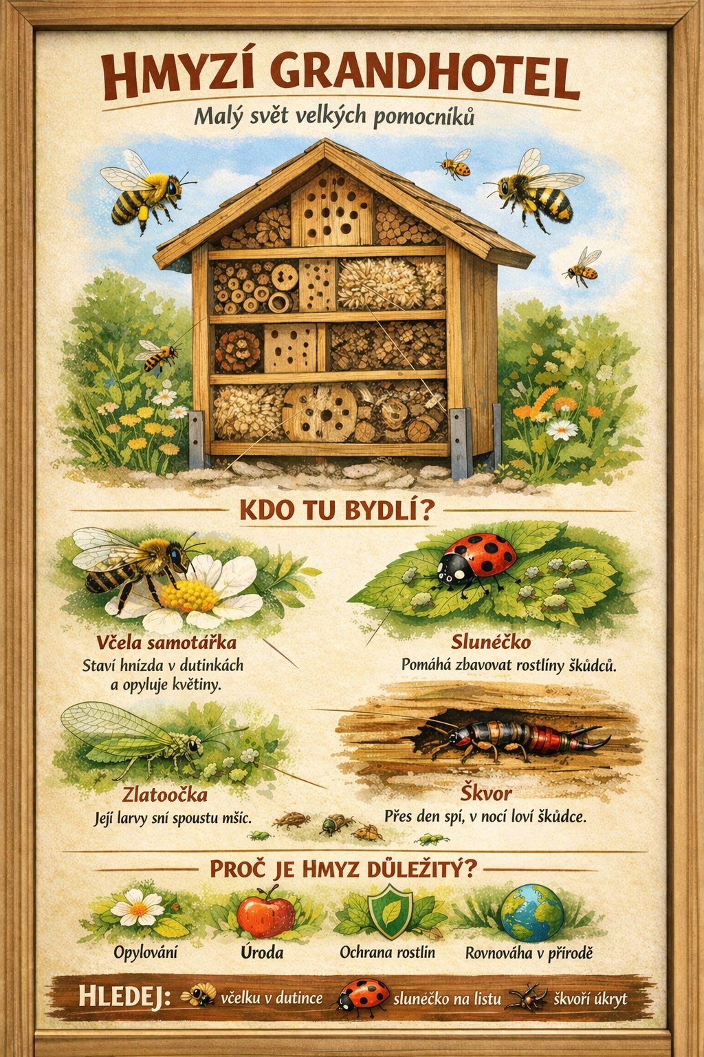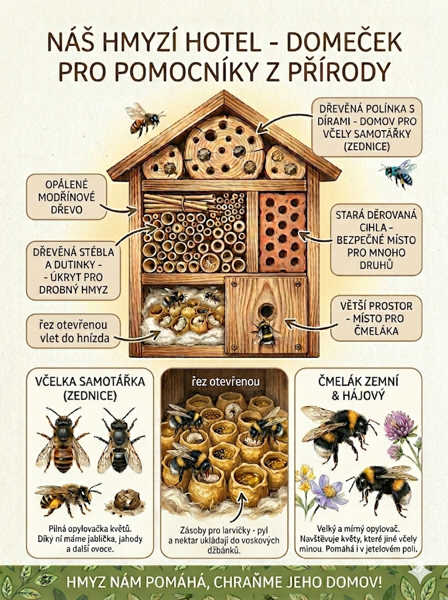 Naučná tabule u hmyzího Grandhotelu není jen doplněk – je to klíč k pochopení života, který se v něm odehrává.